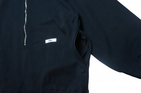 パーカーやクルーネックに飽きた方もいると思いますが、とても着やすく首周りをホールドしてくれます。ポケットにはファスナーが配備されており物の落下も防げます。
